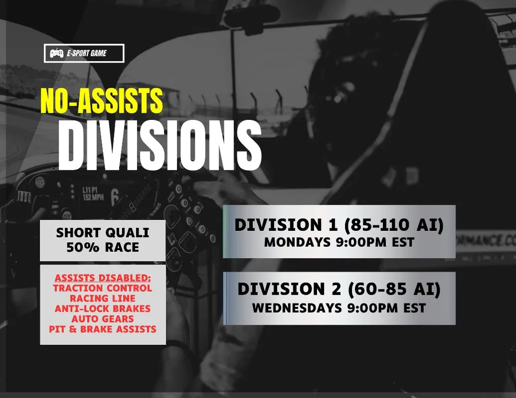 ERA SEASON 6 – NO-ASSISTS DVISION 1 (85-110 AI) Elite Race Away is officially heading into its 6th Season, and we’re looking for dedicated No-Assist drivers to take on the challenge of Division 1! ⏱️ Race Day: Mondays @9:00 PM EST ⚙️ AI Difficulty: 85–110 AI 🏁 Format: Short Qualifying & 50% Race Distance 📅 Key Dates October 19th → Calendar Release & Team Assignments October 27th → Pre-Season Race November 3rd → Official Season 6 Launch Plus: Off-Season Events to stay sharp before lights out! Why Join? - Competitive but respectful racing community - Weekly broadcasted races with commentary & growing ERA media presence - Experienced and mature Admin and Steward team Sign-up & Links ⬇️ Discord: https://discord.gg/vMSnEsgwH5 Instagram: https://www.instagram.com/eliteraceaway?igsh=cmgxdGZzZDlhMzZ4 YouTube: https://youtube.com/@eliteraceaway?si=CXnG7v9mJy9CM9-a