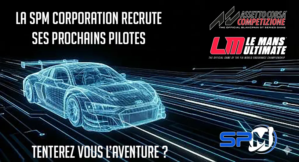 Bonjour à tous. Vous êtes à la recherche d'une structure organisée et qui vous accompagne sur les pistes ? L'association E-Sport SPM CORPORATION, forte de ses 5 ans de présence sur la scène sim-racing ouvre son recrutement. Structure pilote et organisatrice d'évènements, elle saura vous accompagner pour tirer le meilleur de vous même sur piste. Que vous soyez sur ACC ou sur LMU, n'hésitez plus. Discord: https://discord.gg/DkR824WeJA