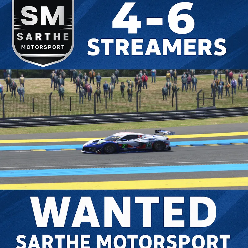Sarthe Motorsport recherche 4 à 6 streamers: Tu aimes le sport auto, les défis et l’ambiance conviviale d’une vraie team passionnée ? Tu cherches une structure sérieuse pour t’accompagner dans tes streams, tout en gardant une bonne dose de fun ? Alors Sarthe Motorsport veut te voir derrière le volant… ou derrière OBS ! 😄 Nous recherchons 4 à 6 streamers pour rejoindre l’aventure et représenter la team lors de nos événements, championnats et sessions communautaires. Ce qu'on propose: Une équipe organisée, motivée et active Une vraie identité visuelle (voitures, overlays, contenus) Une ambiance détendue Du soutien pour développer ta chaîne et créer du contenu Des projets réguliers et des événements où s’éclater Ce qu'on cherche: Des streamers motivés, réguliers et impliqués Une bonne humeur à toute épreuve Pas besoin d’être un pilote pro ! Avoir un setup permettant de stream correctement Intéressé Envoie nous un message ou viens discuter directement : Rejoins Sarthe Motorsport et roule avec nous !